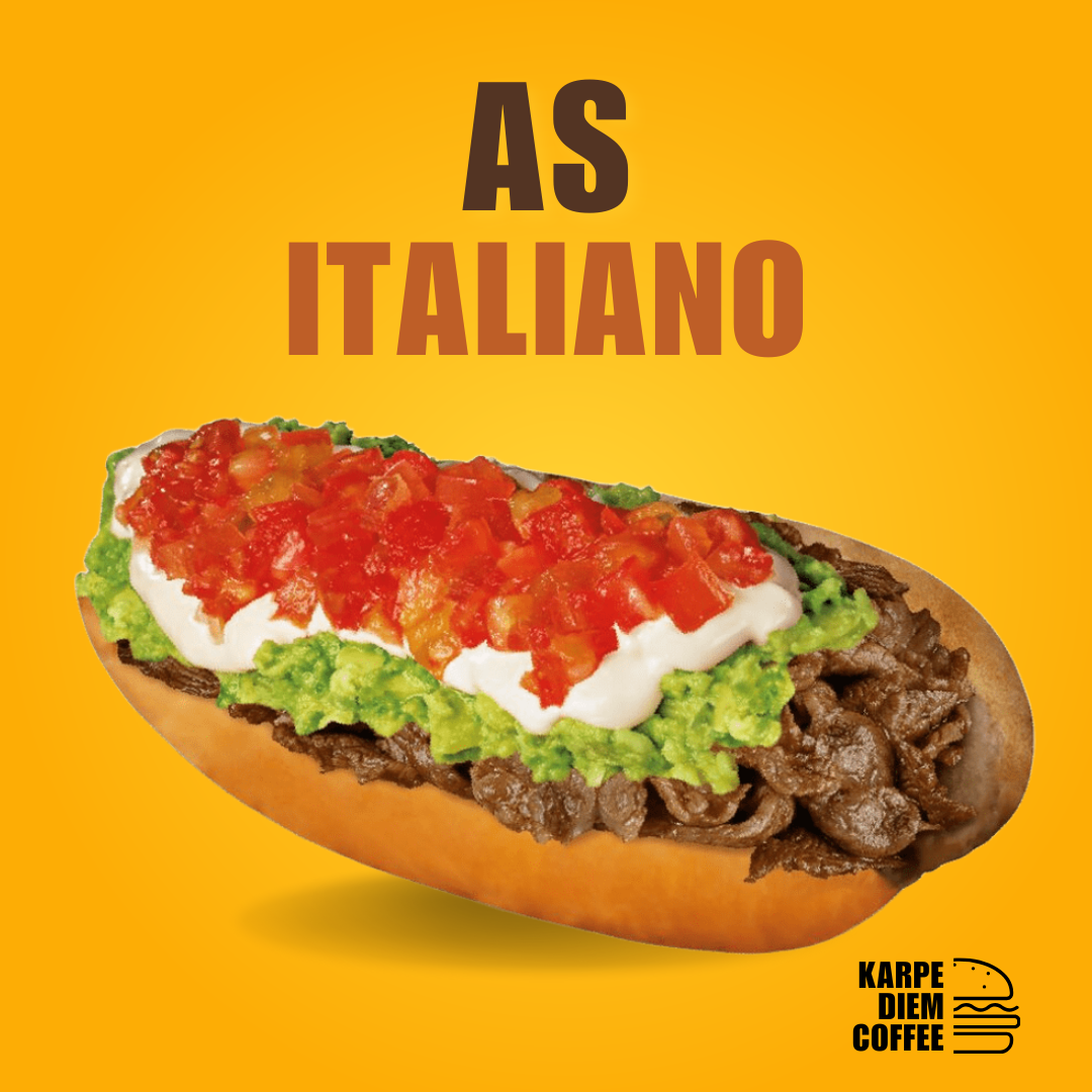 El As Italiano, se compone se un crujiente pan de completo, relleno de churrasco, trozos de tomate, palta y mayonesa casera.